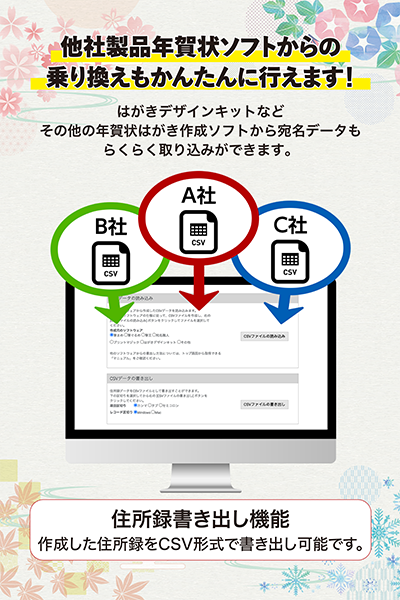 はがきデザインキットなどその他の年賀状はがき作成ソフトから宛名データもらくらく取り込みができます。