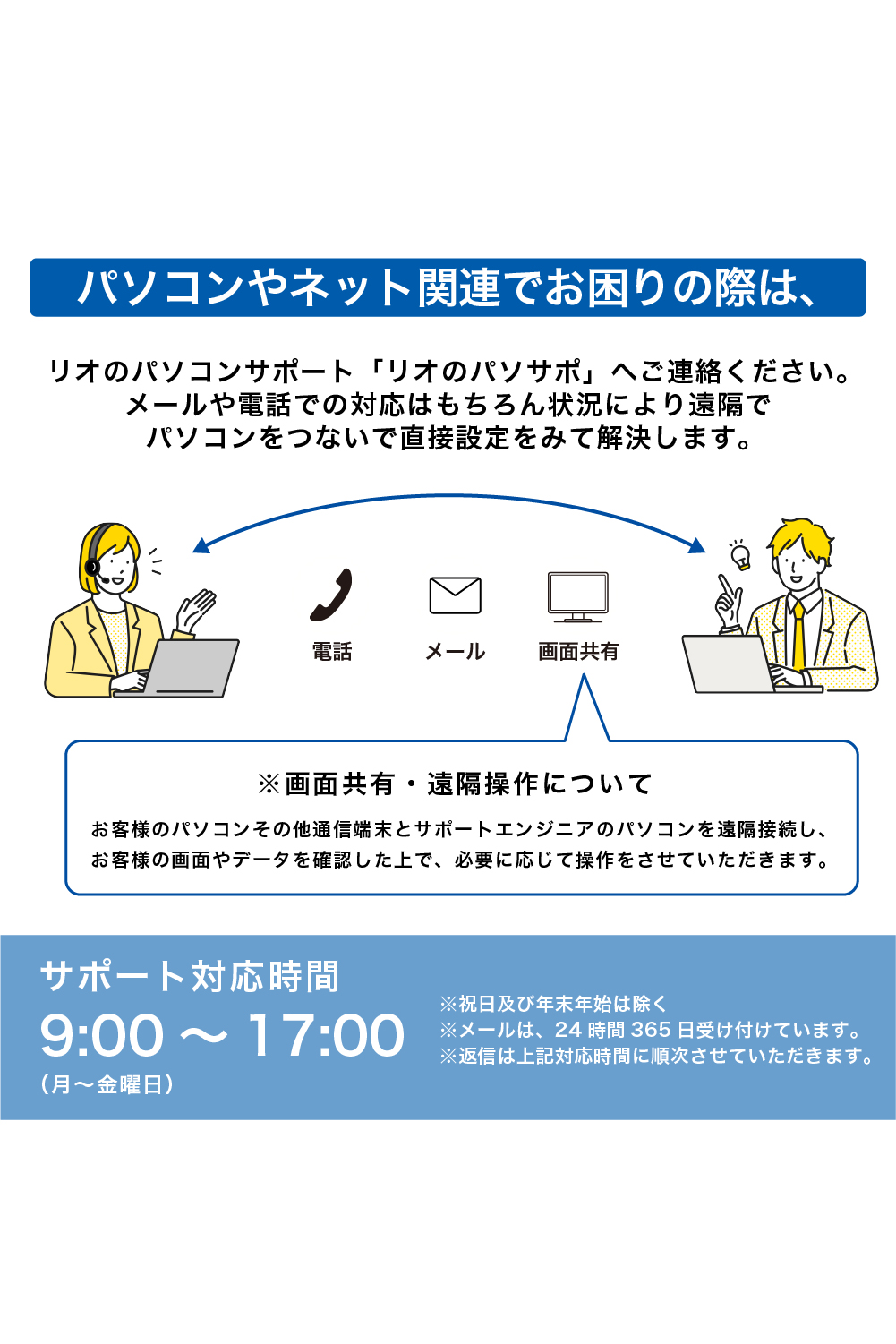 そんな時は、リオのパソコンサポート「リオのパソサポ」へご連絡ください。