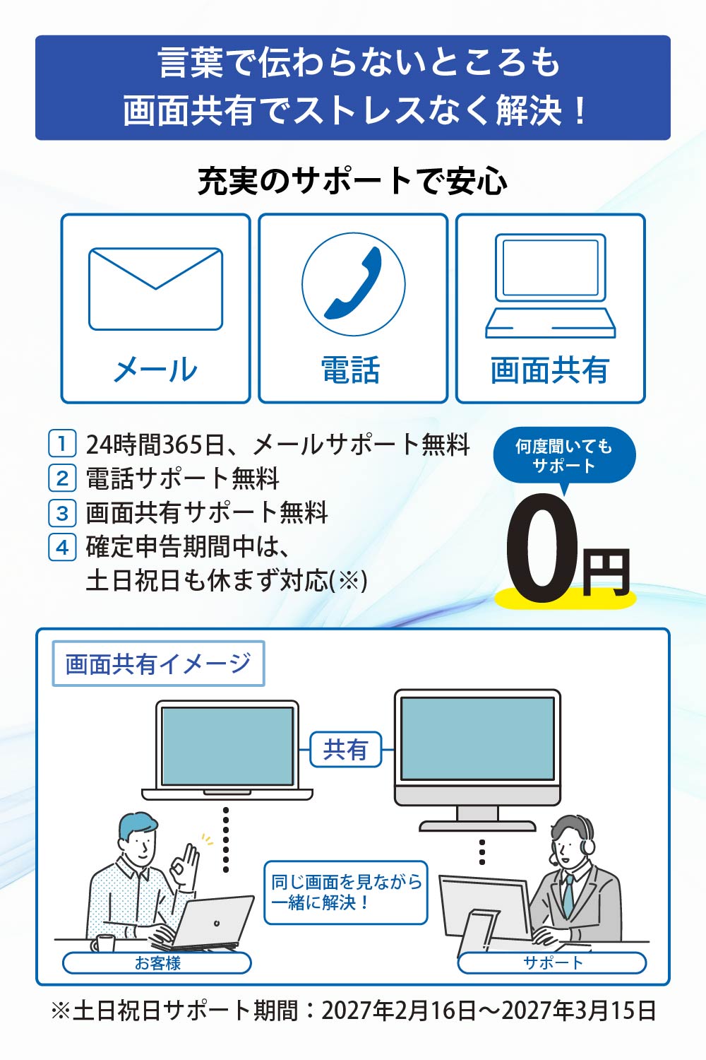 3つの無料サポート付(メール・電話に加え、パソコン画面共有も)